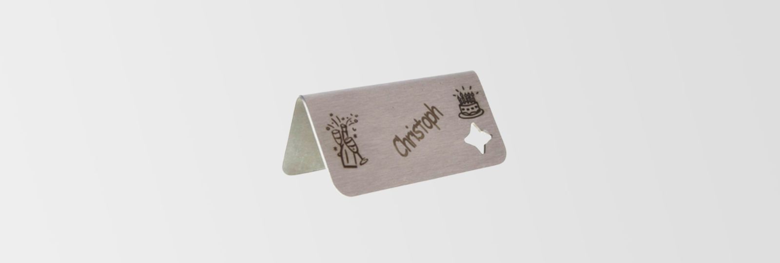 Ob Geburtstagsfeier, Hochzeit oder Taufe, Konfirmation oder Kommunion - unsere Namensschilder aus Edelstahl verschönern jede feierlich gedeckte Tafel. Und dabei sind Sie so individuell wie Sie und Ihre Gäste!Ein Bild vom Jubilar oder Täufling oder das Datum der Feier - Ihrer Kreativität sind keine Grenzen gesetzt.Der Preis ist abhängig von Aufwand und Größe - gerne erstellen wir Ihnen vorab ein Angebot.Der erste Zeichnungsentwurf sowie eine weitere Änderung sind kostenfrei. Jede weitere Änderung wird mit 5,00 Euro berechnet.Lieferzeit nach Absprache.Maße60 x 30 x 30 mmBlechdicke1,5 mmMaterialEdelstahl geschliffenOberflächerostfrei
